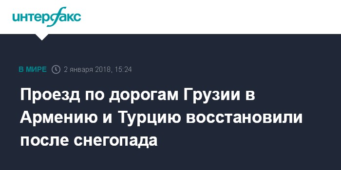 Москва. 2 января. INTERFAX.RU - Движение на дорогах Грузии в направлении Армении и Турции, которые с вечера 1 января из-за интенсивного снегопада были закрыты для передвижения большегрузных автомобилей и автобусов, восстановлено для всех видов транспорта, сообщает во вторник департамент автодорог Минрегионразвития и инфраструктуры Грузии.