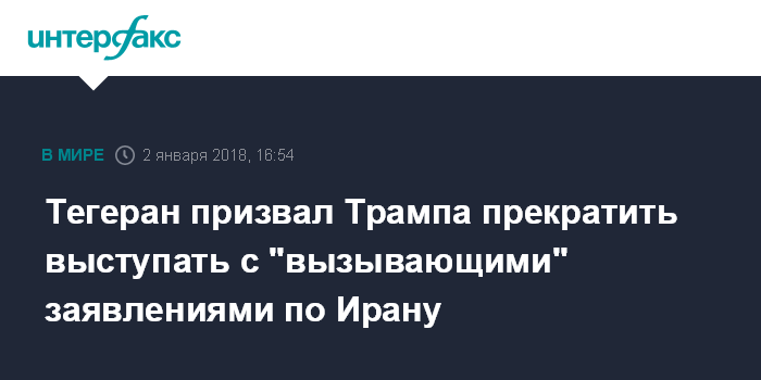 Москва. 2 января. INTERFAX.RU - Иранский МИД во вторник выступил с осуждением позиции президента США Дональда Трампа по ситуации в Иране, призвав его отказаться от неподобающих интервенционистских постов в своем твиттере.