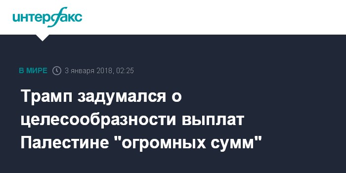 Москва. 3 января. INTERFAX.RU - Американский лидер Дональд Трамп задался вопросом, должны ли США выплачивать Палестине сотни миллионов долларов, когда эта страна не хочет вести мирные переговоры с Израилем.
