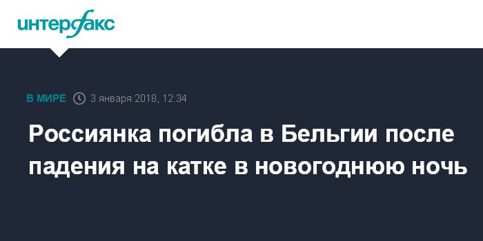 Москва. 3 января. INTERFAX.RU - Российская туристка умерла от черепно-мозговой травмы после падения на катке в бельгийском городе Брюгге в новогоднюю ночь, сообщают в среду местные СМИ со ссылкой на прокуратуру Западной Фландрии.