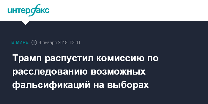 Москва. 4 января. INTERFAX.RU - Президент США Дональд Трамп распустил комиссию по расследованию возможных фальсификаций на президентских выборах 2016 года и поручил данный вопрос министерству внутренней безопасности.