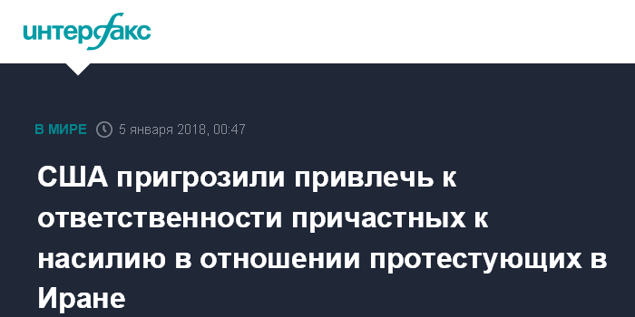 Москва. 5 января. INTERFAX.RU - Вашингтон пригрозил привлечь к ответственности лиц, причастных к применению насилия в отношении участников протестов в Иране.