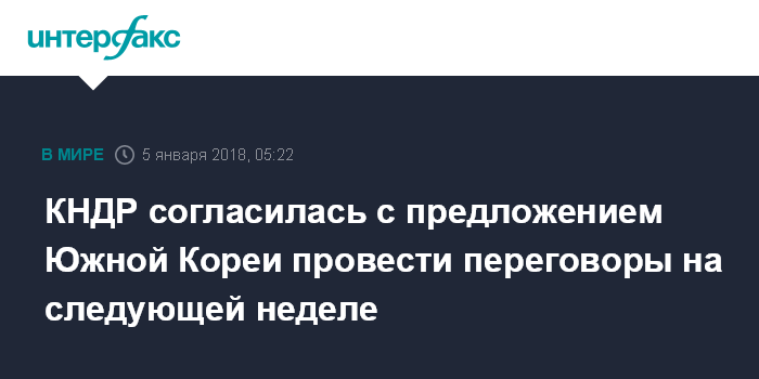 Москва. 5 января. INTERFAX.RU - Южная Корея и КНДР договорились провести на следующей неделе переговоры на высоком уровне, чтобы обсудить возможное участие северокорейских спортсменов в зимних Олимпийских играх в Пхенчхане, а также пути улучшения отношений, передает южнокорейское агентство Ренхап.