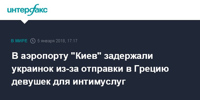 Москва. 5 января. INTERFAX.RU - В аэропорту "Киев" (Жуляны) задержали двух украинок, которые переправляли в Грецию девушек с целью дальнейшей сексуальной эксплуатации, заявил начальник полиции Киевской области Дмитрий Ценов.