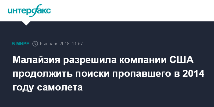 Москва. 6 января. INTERFAX.RU - Правительство Малайзии приняло предложение компании Ocean Infinity, базирующейся в США, продолжить поиски самолета "Боинг 777" авиакомпании Malaysia Airlines, исчезнувшего в марте 2014 года, сообщает в субботу агентство Associated Press.
