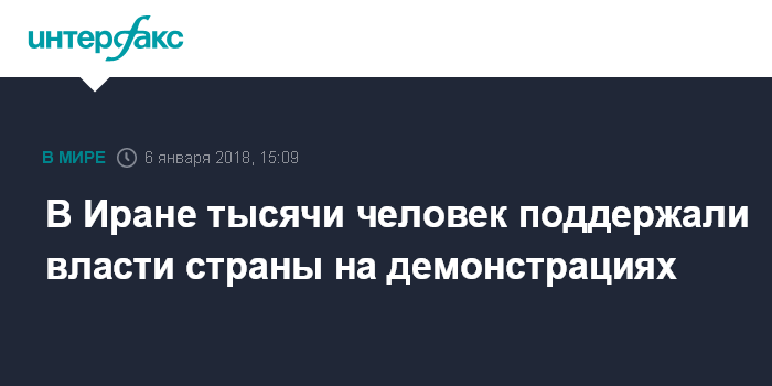 Как сообщалось, на минувшей неделе в Иране прошли акции протеста против политики властей страны. Президент Ирана Хасан Рухани в свою очередь призвал сограждан к спокойствию и напомнил о праве граждан на мирное и законное волеизъявление. По данным местного телевидения, всего в результате беспорядков, сопровождавших акции протеста в разных районах страны, погибли не менее 20 человек.