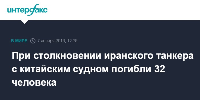 Москва. 7 января. INTERFAX.RU - Все члены экипажа иранского танкера, который столкнулся с китайским судном на восточном побережье Китая в субботу вечером, погибли, сообщило в воскресенье иранское информационное агентство IRNA.