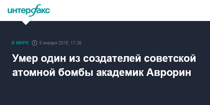 "9 января 2018 года после продолжительной болезни скончался Евгений Николаевич Аврорин, почётный научный руководитель уральского ядерного центра, старейший ветеран атомной отрасли, отдавший созданию ядерного оружия и ядерного щита нашей Родины почти 65 лет своей жизни, выдающийся учёный, академик РАН", - говорится в сообщении пресс-службы.