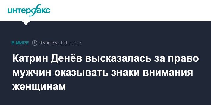 Москва. 9 января. INTERFAX.RU - Около 100 представительниц французской интеллигенции, включая актрису Катрин Денев, подписали открытое письмо, опубликованное в газете Le Monde, в котором высказались в поддержку права мужчин оказывать недвусмысленные знаки внимания женщинам.