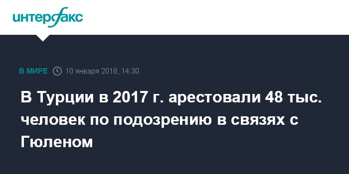 Москва. 10 января. INTERFAX.RU - Силы безопасности Турции в 2017 году арестовали по подозрению в связях с движением FETO, возглавляемым оппозиционным проповедником Фетхуллахом Гюленом, более 48,3 тыс. человек, заявил министр внутренних дел Турции Сулейман Сойлу.
