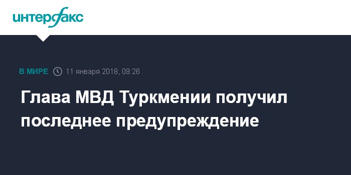 Москва. 11 января. INTERFAX.RU - Президент Туркмении Гурбангулы Бердымухамедов за ненадлежащее исполнение должностных обязанностей и недостатки в подборе и расстановке кадров объявил министру внутренних дел Исгендеру Муликову строгий выговор с последним предупреждением о необходимости исправления в кратчайшие сроки допущенных ошибок.