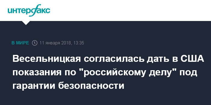 Москва. 11 января. INTERFAX.RU - Адвокат Наталия Весельницкая, фигурирующая в так называемом деле о "российском вмешательстве" в американские выборы 2016 года, готова дать показания конгрессу США при условии, если будет обеспечена безопасность её пребывания в стране.