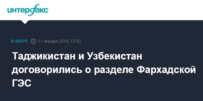 "Касаясь вопросов границы, стороны договорились, что территория, на которой расположена Фархадская ГЭС, будет признана территорией Таджикистана, а сам гидроэнергетический объект - собственностью Узбекистана. Охрану объекта будет осуществлять таджикская сторона, а его техническим обслуживанием будет заниматься Узбекистан", - сообщает агентство.