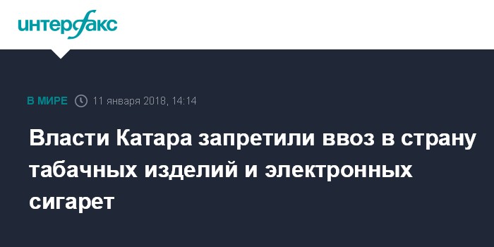 Москва. 11 января. INTERFAX.RU - Запрет на ввоз табака и электронных сигарет вступил в силу на территории Катара, сообщает в четверг Ростуризм со ссылкой на посольство эмирата в РФ.