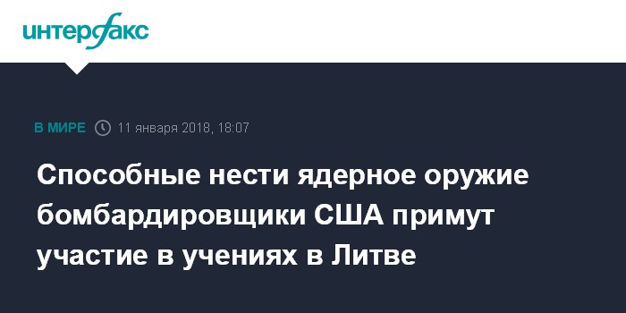 Москва. 11 января. INTERFAX.RU - В учениях ВВС Литвы и США, которые пройдут на этой неделе в районе полигона Казлу-Руда, расположенного в 40 км от границ Калининградской области, будут задействованы стратегические бомбардировщики B-52H, способные нести ядерное оружие.