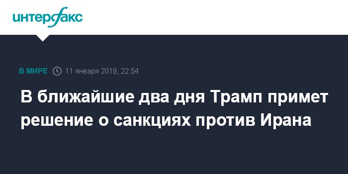Москва. 11 января. INTERFAX.RU - Президент США Дональд Трамп в течение четверга примет решение о том, следует ли Вашингтону продлевать режим приостановки санкций в отношении Ирана в рамках сделки по атому, заключенной Тегераном с "шестеркой" международных посредников, заявил замгоссекретаря Стив Гольдштейн.