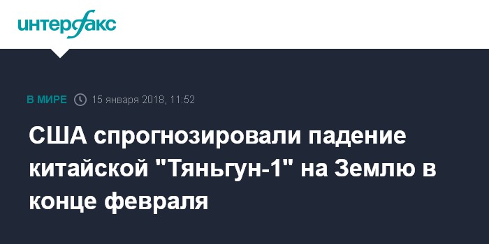 Москва. 15 января. INTERFAX.RU - Первая китайская орбитальная станция "Тяньгун-1" прекратит баллистическое существование на орбите и войдет в плотные слои атмосферы в последние дни февраля, сообщает американский специализированный сайт, пользующийся данными Системы контроля космического пространства США.