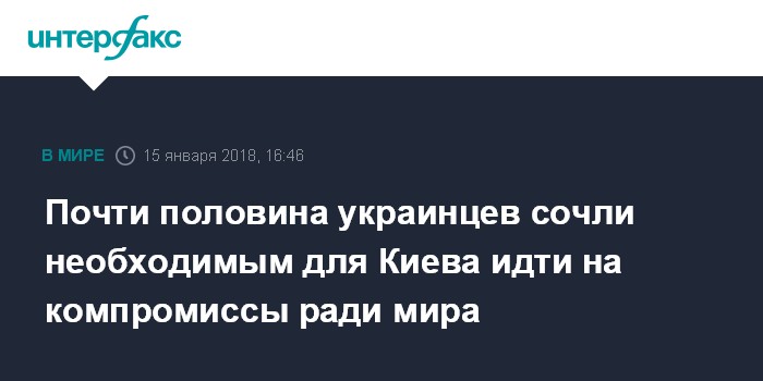 Москва. 15 января. INTERFAX.RU - Лишь 17% населения Украины поддерживают идею установления мира в Донбассе силовым путем, в то время как почти половина считают, что ради мира следует соглашаться на компромиссы. Об этом свидетельствуют результаты общенационального исследования, проведенного фондом "Демократические инициативы" имени Илька Кучерива совместно с социологической службой Центра Разумкова.