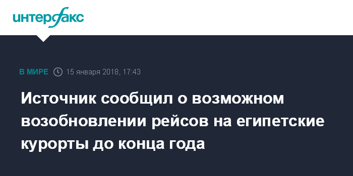 "Обсуждаются технические параметры возобновления прямых перелетов между Москвой и Каиром. Урегулирование всех деталей может занять порядка месяца, и первые самолеты отправятся в середине февраля. Однако пока речи о возобновлении прямого авиасообщения с курортными аэропортами Хургады и Шарм-Эль-Шейха нет", - сказал источник.