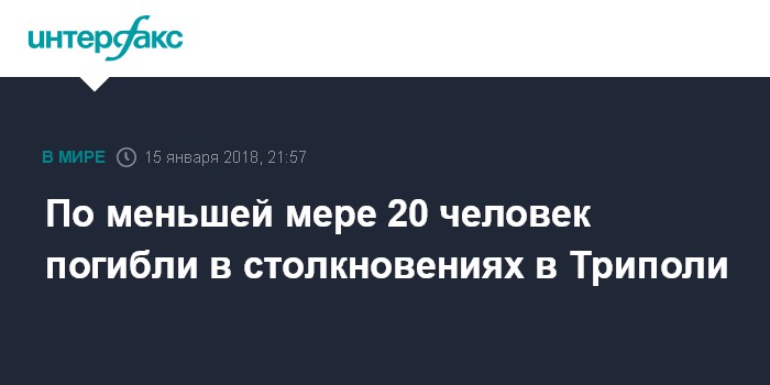 Москва. 15 января. INTERFAX.RU - По меньшей мере 20 человек стали жертвами столкновений в Триполи между различными группами ополчения, лояльными признанному международным сообществом правительству национального единства Ливии, в понедельник, сообщает агентство АР.