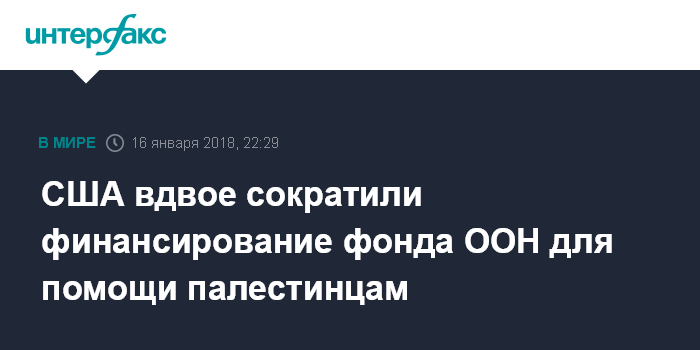 Москва. 16 января. INTERFAX.RU - Администрация США приняла решение сократить выплаты Ближневосточному агентству ООН для помощи палестинским беженцам и организации работ (БАПОР) со $125 млн до $60 млн, сообщает во вторник Bloomberg со ссылкой на заявление госдепартамента США.
