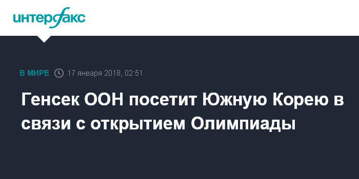 Москва. 17 января. INTERFAX.RU - Генеральный секретарь ООН Антониу Гутерриш сообщил о планах посетить Южную Корею в феврале в связи с открытием Олимпийских игр в Пхенчхане.