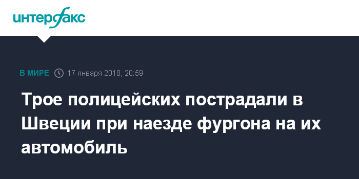 Москва. 17 января. INTERFAX.RU - Трое сотрудников правоохранительных органов Швеции пострадали, когда в их автомобиль въехал фургон, сообщила в среду шведская газета Expressen.