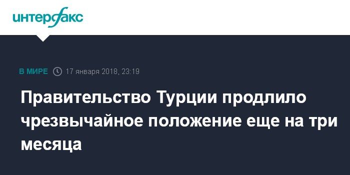 Москва. 17 января. INTERFAX.RU - Чрезвычайное положение в Турции в среду продлено еще на три месяца, сообщил вице-премьер Бекир Боздаг.