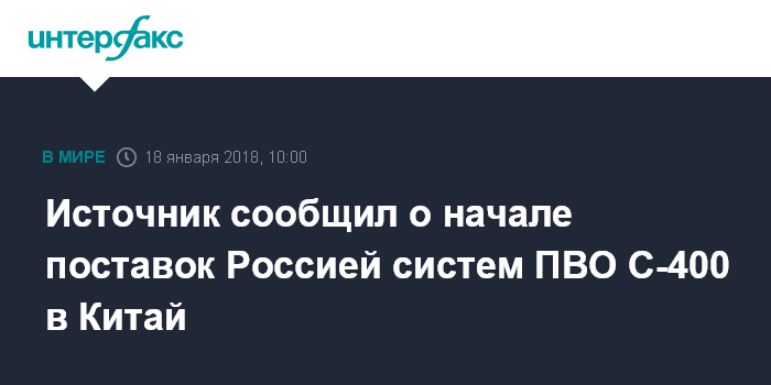 Москва. 18 января. INTERFAX.RU - Россия начала поставки по контракту систем противовоздушной обороны (ПВО) С-400 "Триумф" в Китай. Об этом сообщил "Интерфаксу" в четверг информированный источник.