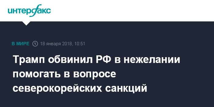 Москва. 18 января. INTERFAX.RU - Президент США Дональд Трамп обвинил Россию в том, что она не помогает США в вопросе имплементации санкций против КНДР, сообщает телеканал Fox News со ссылкой на интервью Трампа агентству Reuters.