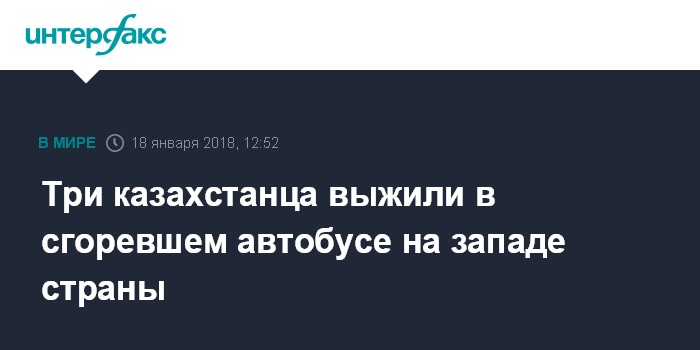 Москва. 18 января. INTERFAX.RU - По уточненным данным, в сгоревшем автобусе в Актюбинской области Казахстана находились трое граждан Казахстана, все они выжили, сообщили агентству "Интерфакс" в ДЧС области.