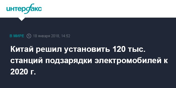 Москва. 18 января. INTERFAX.RU - Государственная электросетевая корпорация Китая (State Grid Corporation of China, SGCC) планирует к 2020 году создать сеть из 120 тыс. общественных колонок для зарядки электромобилей.