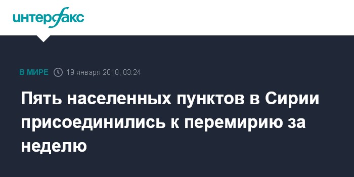 Москва. 19 января. INTERFAX.RU - Пять населенных пунктов в Сирии за неделю присоединились к процессу примирения, сообщает в пятницу официальный печатный орган Минобороны РФ газета "Красная Звезда". Согласно инфографике на сайте издания, всего в процессе примирения участвуют 2330 населенных пунктов Сирии.