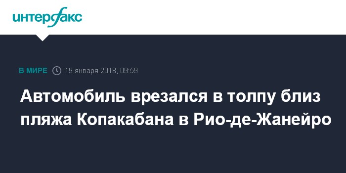 Москва. 19 января. INTERFAX.RU - Автомобиль врезался в толпу близ пляжа Копакабана в бразильском городе Рио-де-Жанейро, погибла восьмимесячная девочка, еще минимум 16 человек получили травмы, сообщает в пятницу газета Globo.