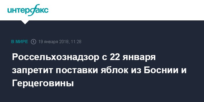 Москва. 19 января. INTERFAX.RU - Россельхознадзор с 22 января запрещает поставки яблок из Боснии и Герцеговины.