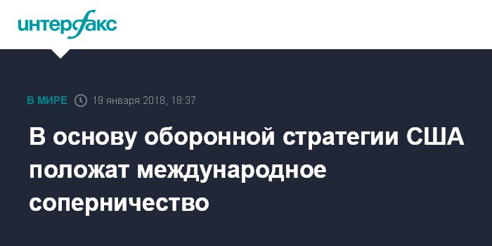 Москва. 19 января. INTERFAX.RU - В основе национальной оборонной стратегии США, которую министр обороны Джеймс Мэттис представил в пятницу, будет лежать соперничество с другими странами, а не борьба с терроризмом.