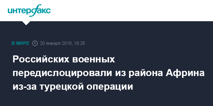 Москва. 20 января. INTERFAX.RU - Российские военные передислоцированы из района сирийского Африна, где турецкая армия проводит операцию против курдских формирований, сообщили в Минобороны РФ.