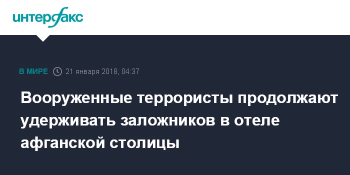 Москва. 21 января. INTERFAX.RU - Террористы, захватившие отель Intercontinental в столице Афганистана, продолжают удерживать постояльцев и персонал в качестве заложников, периодически из здания отеля звучат выстрелы, сообщают СМИ со ссылками на заявления очевидцев, властей и полиции.