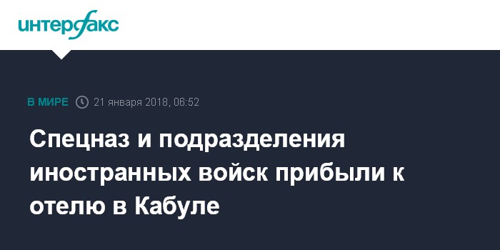 Москва. 21 января. INTERFAX.RU - К отелю Intercontinental, расположенному на холме Bagh-e-Bala в северо-западной части Кабула, подъехали подразделения иностранных войск, а также спецназ управления безопасности Афганистана, сообщил с места событий корреспондент телеканала Tolo News.