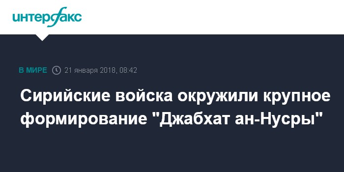 Москва. 21 января. INTERFAX.RU - Сирийские войска на востоке провинции Идлиб окружили крупное формирование террористической группировки "Джабхат ан-Нусра" (запрещена в РФ) и освободили от боевиков важный аэродром, сообщает в воскресенье Минобороны РФ.
