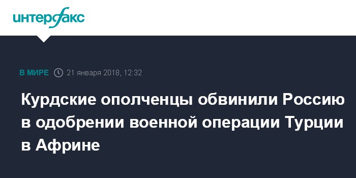 Москва. 21 января. INTERFAX.RU - Россия наравне с Турцией несет ответственность за удары, которая турецкие ВВС нанесли по контролируемому курдским ополчением сирийскому району Африн, сообщило агентство Иракского Курдистана Rudaw.