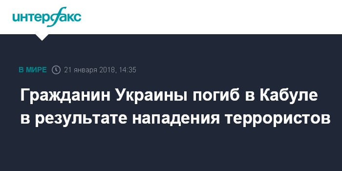 Москва. 21 января. INTERFAX.RU - Одной из жертв террористической атаки на гостиницу Intercontinental в Кабуле стал гражданин Украины, сообщил в воскресенье официальный представитель департамента консульской службы МИД Украины Василий Кирилич.