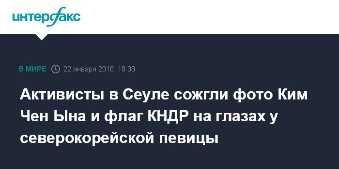 Москва. 22 января. INTERFAX.RU - В Сеуле в понедельник прошли акции протеста, приуроченные к визиту вокалистки северокорейского музыкального коллектива "Моранбон" Хен Сон Воль - активисты сожгли у нее на глазах портрет северокорейского лидера Ким Чен Ына, а также флаг КНДР и знамя примирения двух стран, сообщают местные СМИ.