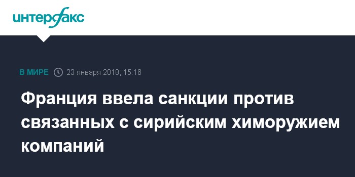 Москва. 23 января. INTERFAX.RU - Власти Франции во вторник ввели санкции против двух с половиной десятков компаний и частных лиц, имеющих отношение к программе сирийского химоружия, сообщают во вторник французские СМИ.