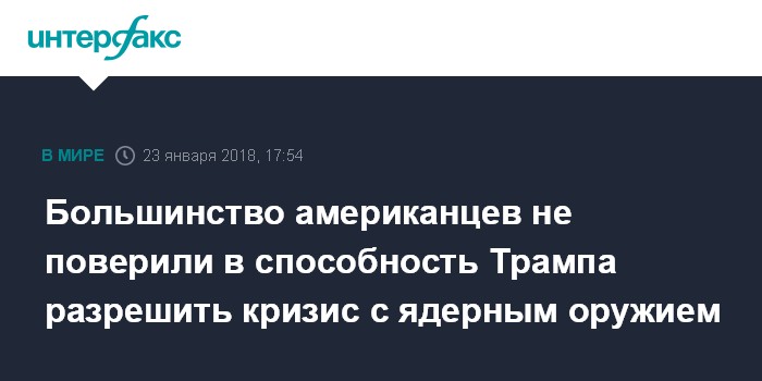 Москва. 23 января. INTERFAX.RU - Большинство американцев (60%) не верят, что президент страны Дональд Трамп смог бы ответственно подойти к решению вопроса о том, следует ли применять ядерное оружие против других стран, сообщает во вторник телеканал NBC News со ссылкой на совместный опрос с The Washington Post.