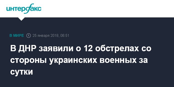 Москва. 25 января. INTERFAX.RU - В самопровозглашенной Донецкой народной республике (ДНР) за сутки зафиксировали 12 нарушений режима прекращения огня со стороны вооруженных сил Украины (ВСУ), заявил журналистам представитель оперативного командования ДНР.