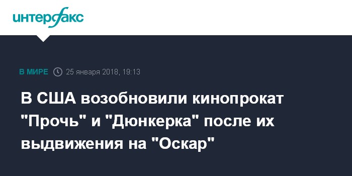 Москва. 25 января. INTERFAX.RU - Американские кинотеатры вернули на экраны фильмы "Прочь" и "Дюнкерк" после того, как они попали в список номинантов на премию "Оскар".