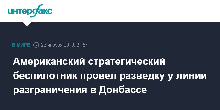 Москва. 26 января. INTERFAX.RU - Стратегический беспилотный летательный аппарат ВВС США RQ-4B в пятницу совершил многочасовой разведывательный полет вдоль линии разграничения в Донбассе, сообщается на западных авиационных ресурсах.