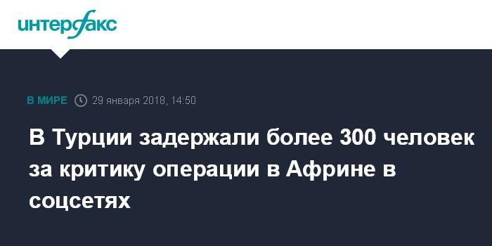 Москва. 29 января. INTERFAX.RU - В Турции задержали за "пропаганду терроризма" 311 человек, критиковавших в социальных сетях операцию войск страны в сирийском Африне, сообщает газета Daily Sabah со ссылкой на МВД Турции.