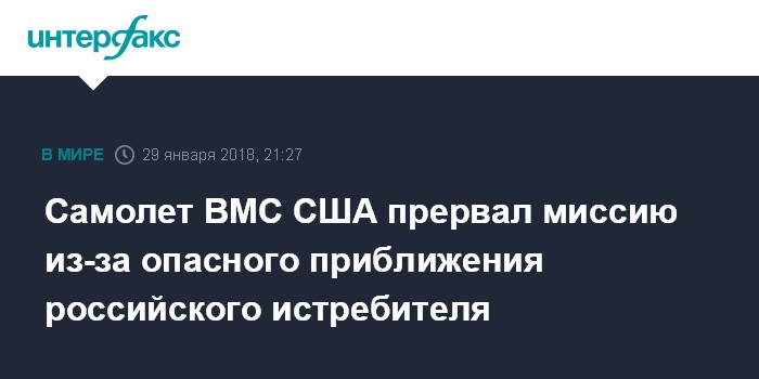 Собеседники CNN сообщили, что, по данным американских пилотов, истребитель ВКС РФ в понедельник прошел в пяти футах (полутора метрах) от самолета ВМС США в международном воздушном пространстве. Действия российского истребителя вынудили экипаж американского самолета преждевременно завершить миссию, отмечают источники телеканала.